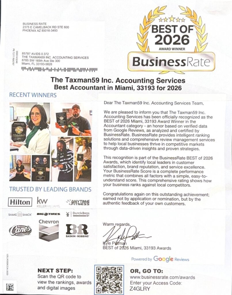 We are pleased to inform you that The Taxman59 Inc. Accounting Services has been officially recognized as the BEST of 2026 Miami, 33193 Award Winner in the Accountant category — an honor based on verified data from Google Reviews, as analyzed and certified by BusinessRate. BusinessRate provides intelligent ranking solutions and comprehensive review management services to help local businesses thrive in competitive markets through data-driven insights and proven strategies.